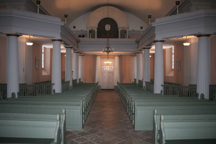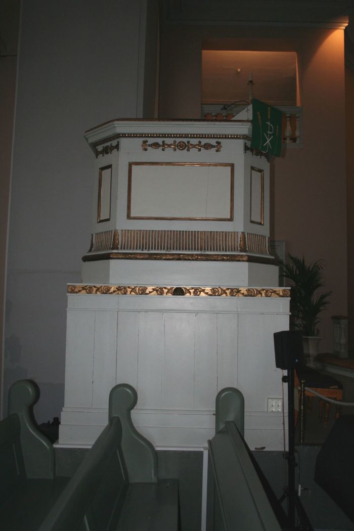 kirke. Prekestolen er i tre. Det er fem lysekroner i kirken, alle fra 1837.