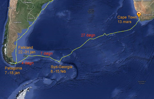 Turen startet i januar 2016 og varte i tre måneder, under både spennende, interessante og til tider farlige forhold på havet. Reisen begynte i Ushuaia, helt sør i Argentina. Etter først å ha seilt og utforsket Patagonia, gikk seilasen via Falklandsøyene til Sør-Georgia, og derfra på en 28-dagers seilas til Cape Town i Sør-Afrika.