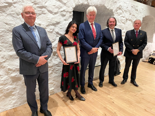 og de fikk påsatt Rotary nålen og overrakt 4-spørsmålsprøven innrammet.
